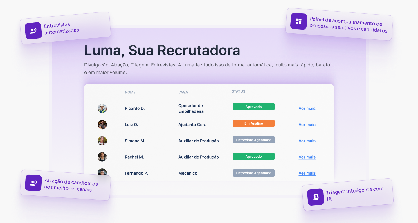 A Luma é sua assistente de recrutamento com inteligência artificial que capta, tria e entrevista candidatos para vagas operacionais de forma automática e eficiente.